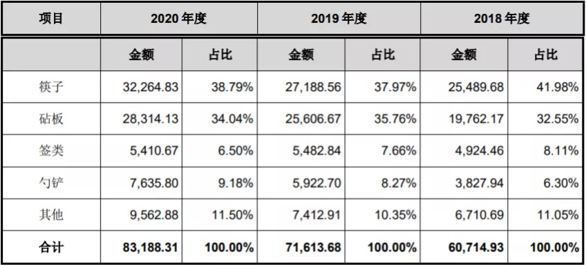 小小的筷子与砧板撑起了双枪科技营收的半壁江山。招股书显示,2018年至2020年营业收入分别为6.08亿元、7.18亿元和8.34亿元,对应的归母净利润分别为4596.82万元、7183.99万元和8976.11万元。其中,筷子与砧板两大产品的销售金额,合计分别占总营收的74.53%、73.73%和72.83%。