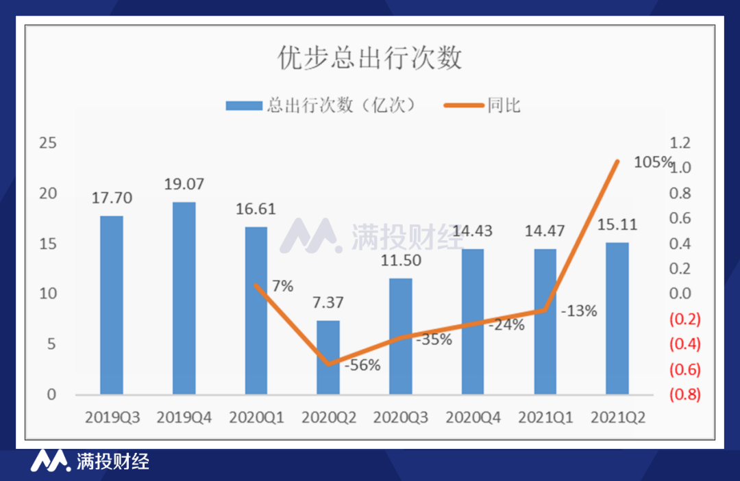 再来看优步的用户指标。作为网约车公司,疫情限制用户出行后,体现在出行次数上就是断崖式的下跌,2020年二季度是疫情影响最严重的时期,优步的出行数量同比下降了56%至7.37亿人次,不足前季度的一半。之后随着消费者出行的逐渐恢复,用户出行次数在近几个季度均实现环比增长,并在连续四个季度同比为负之后,在本季度出行次数同比转负为正,实现同比105%的大幅增长,达到15.1亿人次。