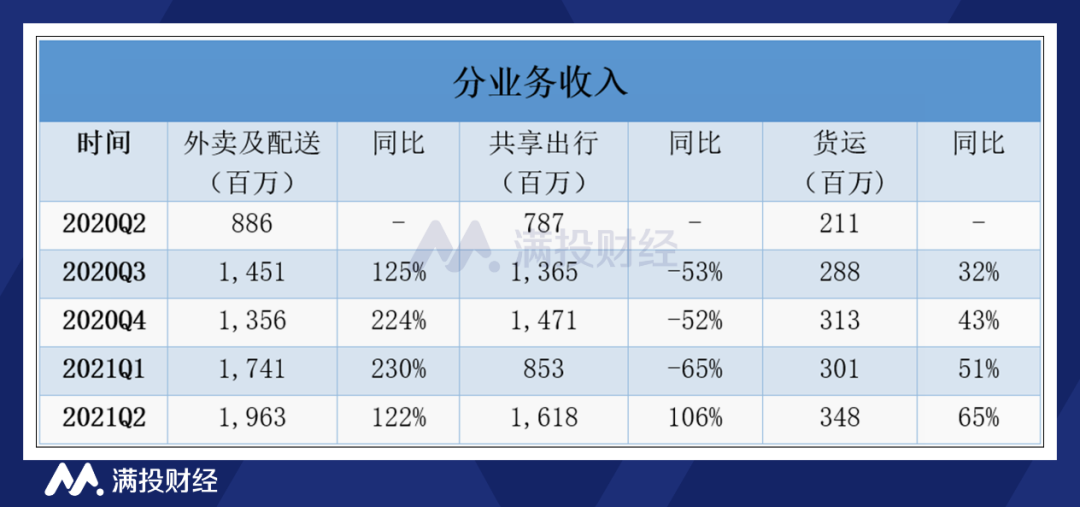 优步有三块业务,分别是外卖及配送、共享出行、货运。其中,共享出行是优步的核心业务,但这块业务也是受到疫情冲击最严重的业务,本季度以前的前几个季度,该业务收入同比均大幅下滑,本季度已恢复增长,同比增幅为106%,达到16.18亿美元。