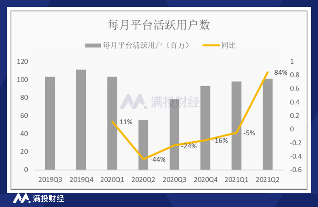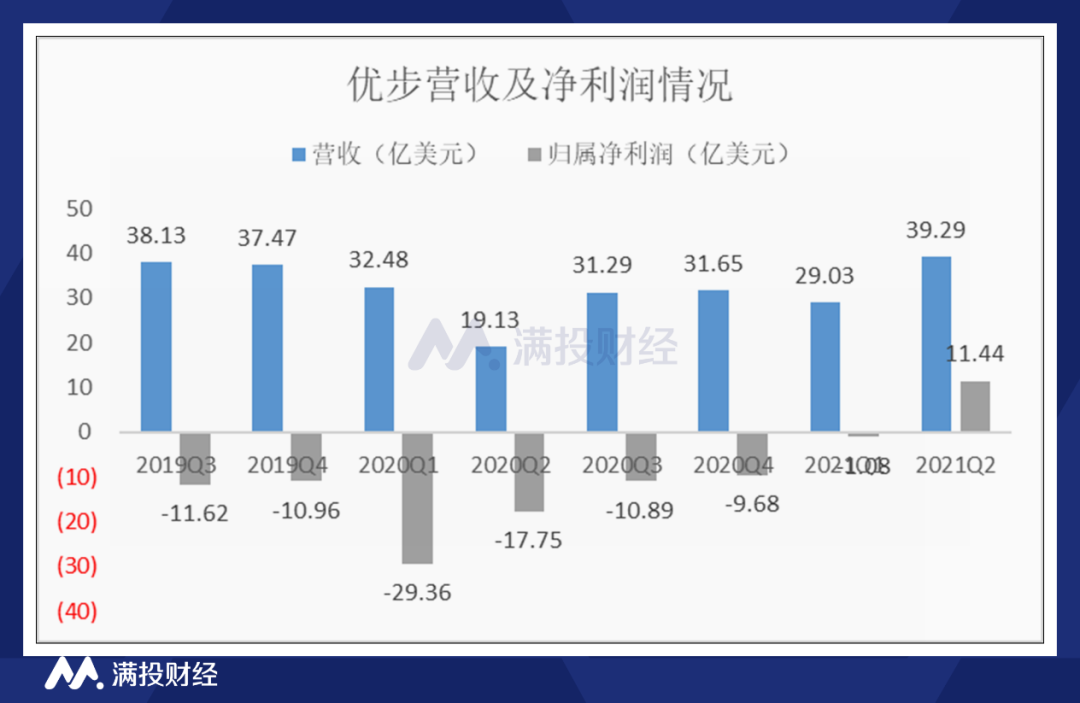 先来看优步近几个季度的营收及净利润的表现。疫情对网约车行业的打击是显而易见的,优步的营收自2019年三季度后,逐季下滑,并于2020年二季度达到低点,之后开始反弹。优步于本季度实现39.29亿美元的营收,同比增长105%,环比增长35%,这个营收水平已经恢复至2019年三季度之前,也就是疫情前的水平。公司解释为对司机加强了投资作为复苏的手段,2-7月,美国每月活跃的司机和快递员增加了近42万人。