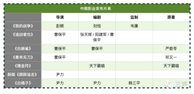去年5月27日成立的江苏中南影业有限公司(以下简称“中南影业”)在昨天公布了七部新片片单,分别是《追凶者也》《白麻雀》《秦末无刀》《白橘子》《摸金符》《我的战争》和新版《跟踪追击》。