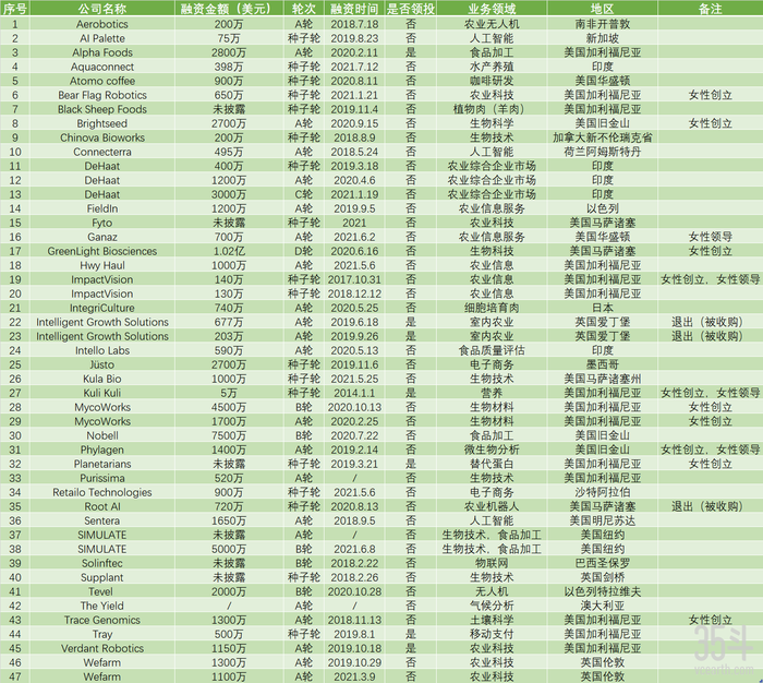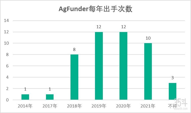 AgFunder 专注于农业技术和食品技术价值链的种子轮到B轮的初创公司。在过去 8 年中共出手 47 次,投资 41 家公司,7 次领投。以下是 35 斗整理的其过往投资的数据,我们将根据投资数据分析其投资偏好和投资理念。