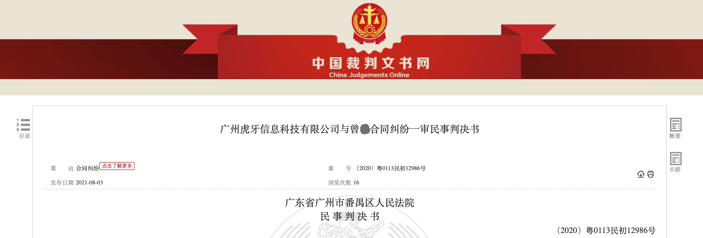 据天眼查APP显示,8月3日,中国裁判文书网公开广州虎牙信息科技有限公司与曾某同纠纷一审民事判决书,案号(2020)粤0113民初12986号,审理法院为广东省广州市番禺区人民法院。