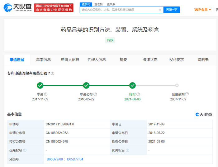 据天眼查App显示,8月6日,北京小米移动软件有限公司“药品品类的识别方法、装置、系统及药盒”专利获授权,公告号为CN108062497B,申请日期为2017年11月。