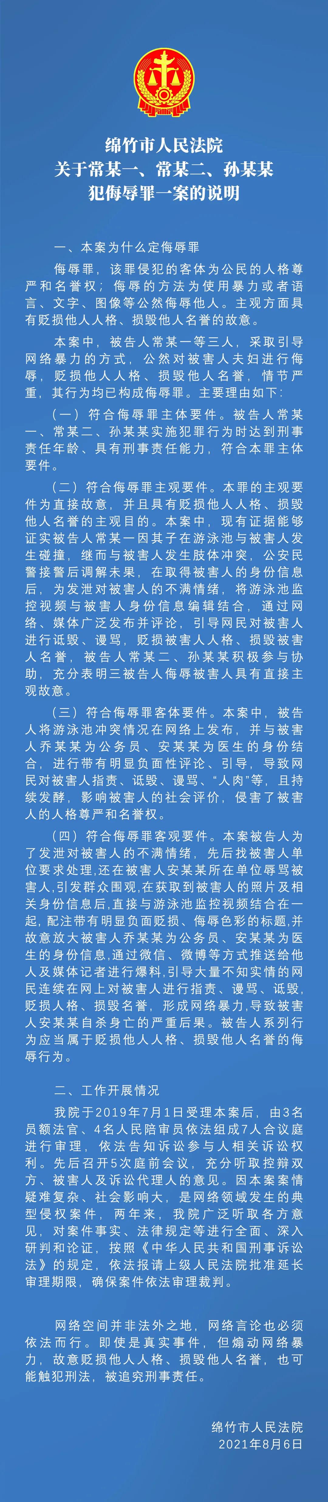 据四川省绵竹市人民法院消息,2021年8月6日,绵竹市人民法院对绵竹市人民检察院指控被告人常某一、常某二、孙某某犯侵犯公民个人信息罪一案依法恢复法庭审理并公开宣判,以三被告人犯侮辱罪判处常某一有期徒刑一年六个月;常某二有期徒刑一年,缓刑二年;孙某某有期徒刑六个月,缓刑一年。