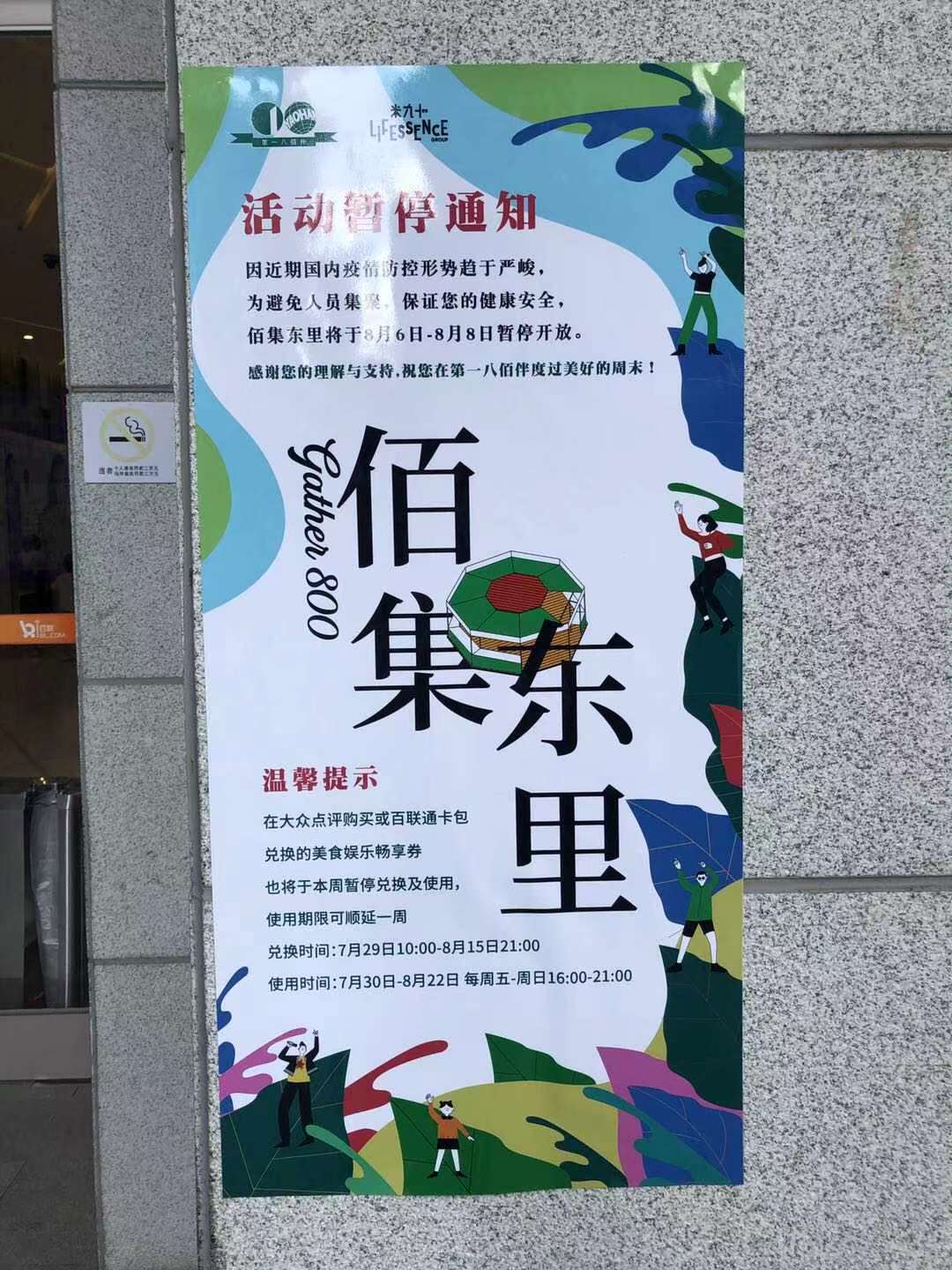 八佰伴公告,由于疫情防控形式趋于严峻,八佰伴的户外活动——佰集东里将于8月6日至8日暂停开放;美罗城公告,原定于2021年8月5日至8月15日举办的美罗城五番夜市将延期举办;思南公馆也对外公告,近期思南读书会相关活动暂停,上海国际文学周一并延期举办。