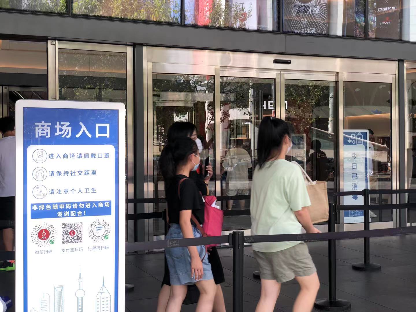2021年8月6日,位于浦东新区的陆家嘴中心商场,每个入口都已张贴出健康提示,提醒往来市民游客注意佩戴口罩进入商场,并接受体温检测。同时,佩戴口罩的消费者需要出示随申码和行程码,显示绿码方才能进入陆家嘴中心商场。