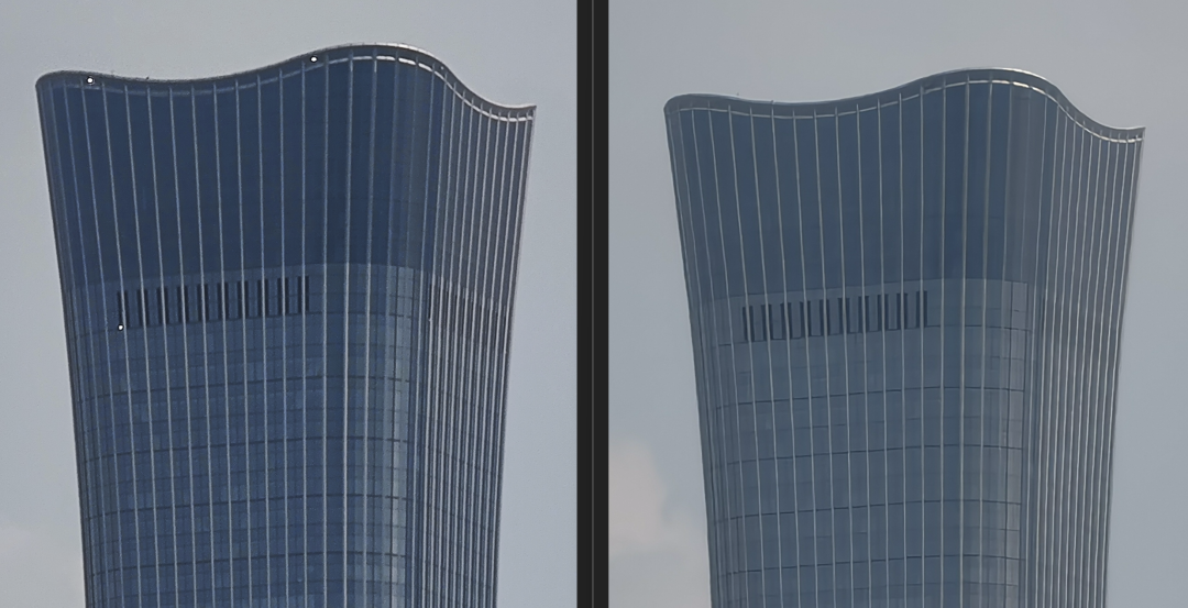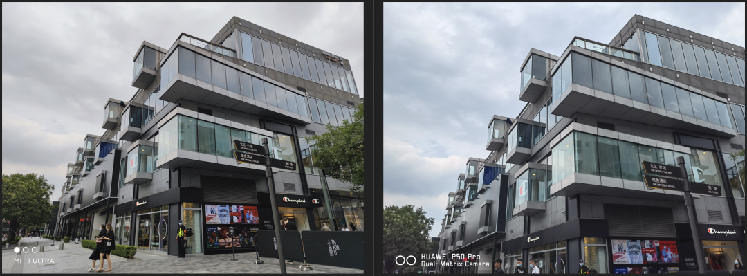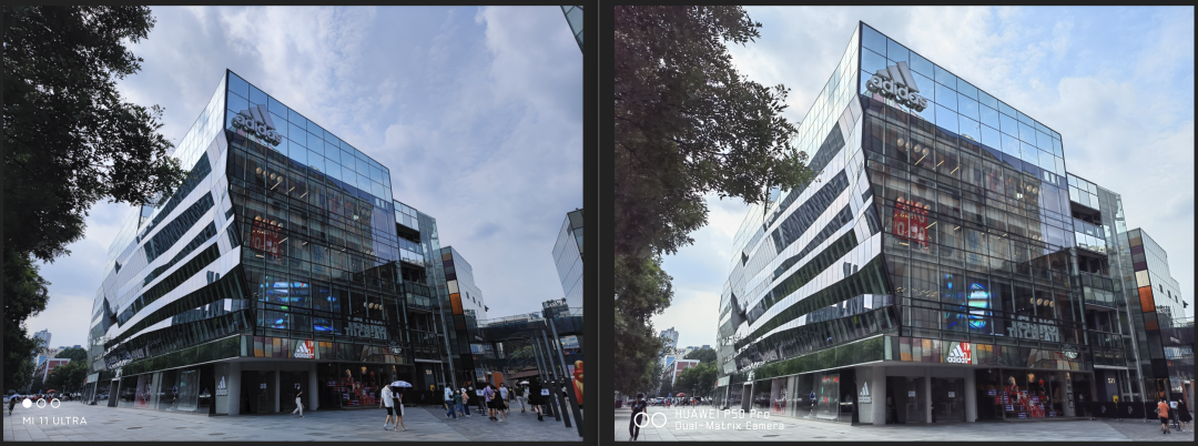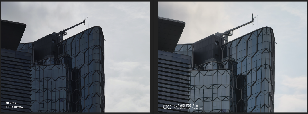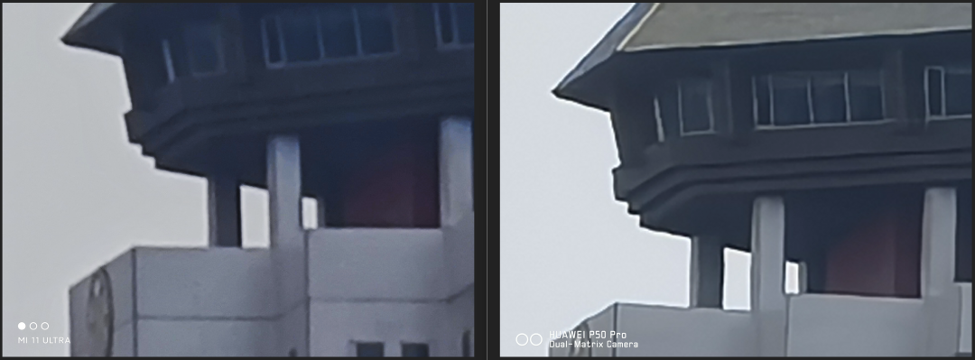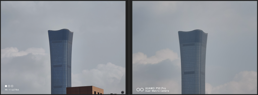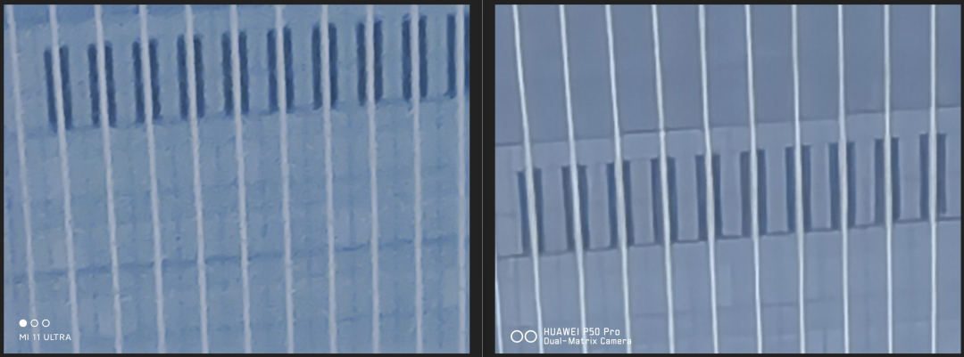上面是一组中国尊10倍变焦拍摄成片,我们可以看出,右侧华为拍摄的照片要更加纯净,左侧小米拍摄照片中,有较多噪点,并且在画面色彩还原上,华为更接近我肉眼观看的效果,小米成像则像是进行了锐化处理。