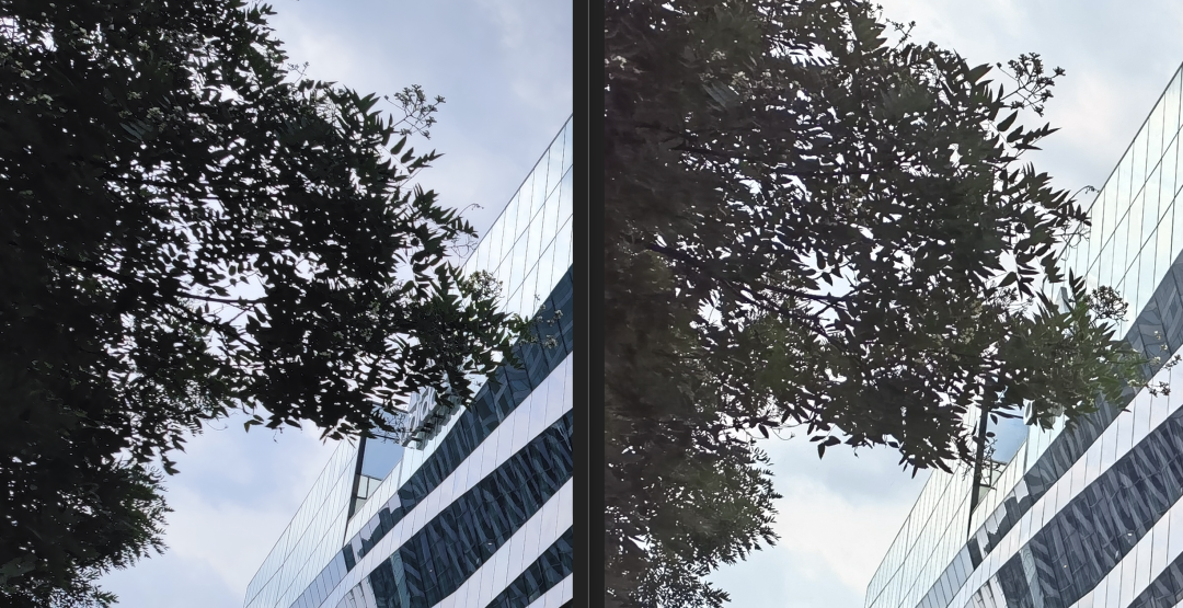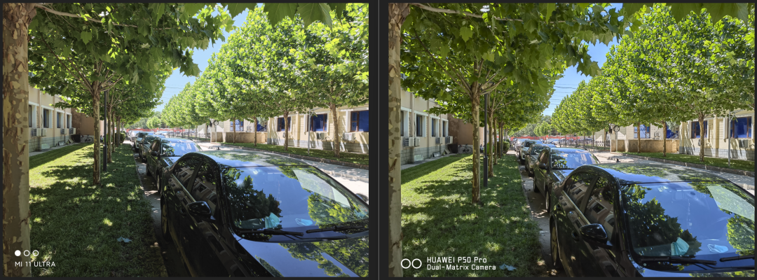 而从细节来看,华为P50 Pro拍出来的照片,其动态范围也要更有优势,比如在树叶部分,华为照片中还能看到树叶的层次,而小米照片中的树叶部分基本就比较难以分辨了。