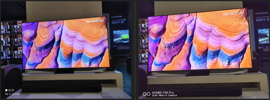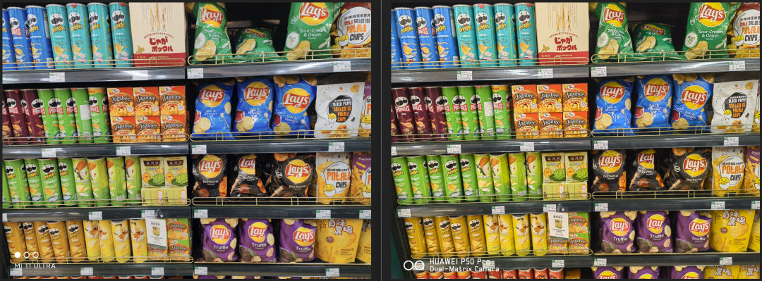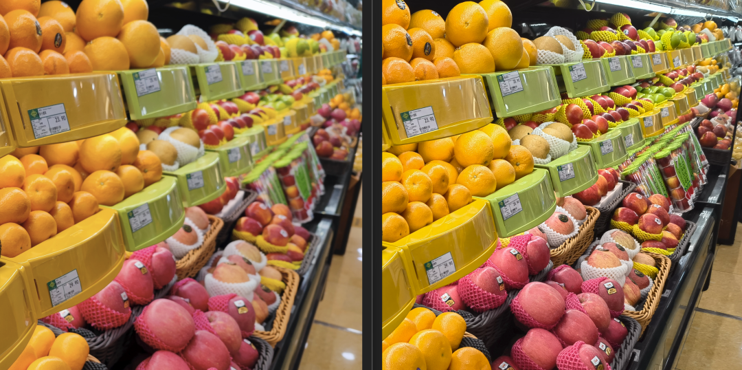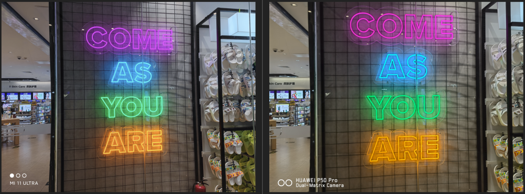 在色彩还原方面,华为成片会相对自然一些,比如在这组服装店的样张中,左侧色调明显偏冷,而右侧偏暖,但我实际的观看体验则与右侧更为接近,华为对于图像整体色调的把握会更为准确一些。