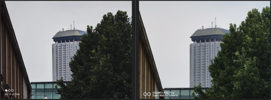 在这组10倍变焦建筑拍摄中,右侧华为拍摄的照片更接近肉眼观看的真实色彩。
