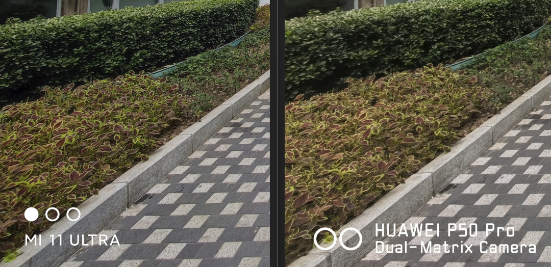 在这组草地样张的细节放大图中,我们可以明显看到,华为P50 Pro成像的解析力更强,画面的动态范围也更好。