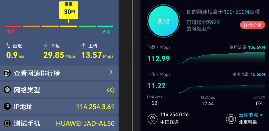 实际上,同一部手机、同一张SIM卡,在不同地区的网速差异是非常大的,比如我在北京东五环室外测得的下载速率约为30Mbps,而在北四环室外则能够得到113Mbps的下载速度,目前4G网速的标准大概在10-100Mbps。
