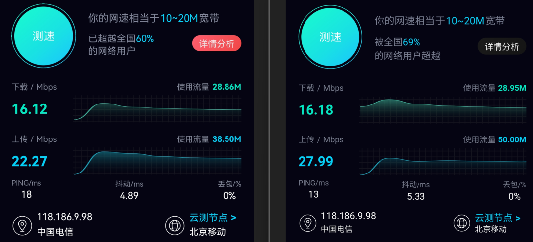 在室内WiFi场景中,两者再次得出十分接近的4G下载速度。
