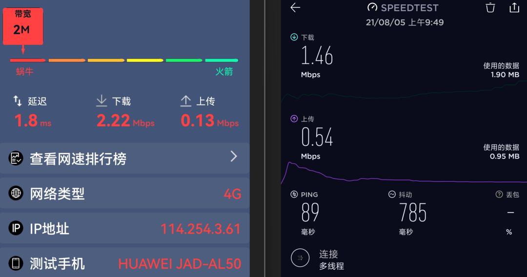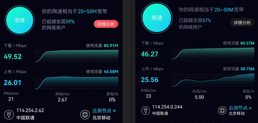 在室内同一地点,使用同一张SIM卡,搭载麒麟9000的华为P50 Pro和搭载骁龙888的小米11Ultra跑出了非常接近的4G下载速度,均在45-50Mbps左右,相差的速度基本可以看作误差。