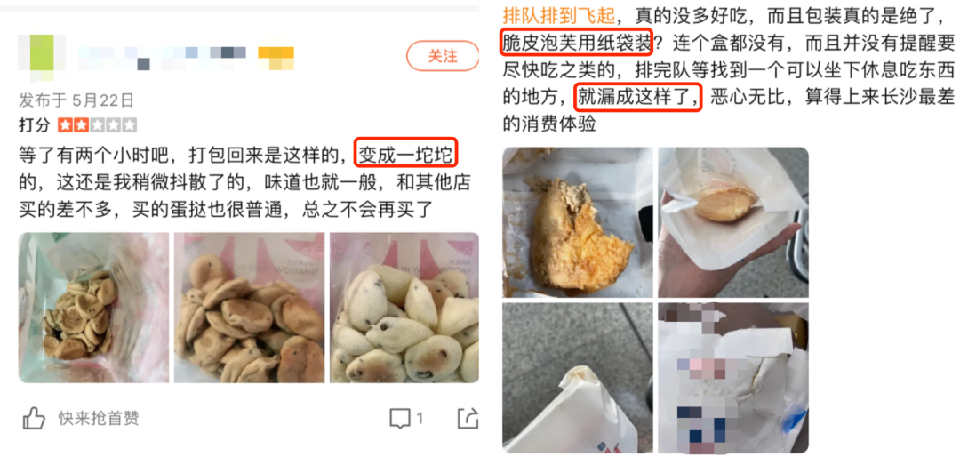 由于天气和包装的影响,食材的“娇气”特性也被放大,影响食用口感。开菠萝财经翻看大众点评用户评论发现,两家的王牌产品麻薯,都需要趁热吃,但这一明星产品只能排队购买不能扫码点单,排队时间长加一整袋放置的包装,使食物“坨到一块”,“口感也变硬”。泡芙单品也出现了类似情况,有网友称,直接用袋子装的泡芙如果不立即食用,会出现“内陷外渗,表皮扁塌,品相糟糕”的问题。