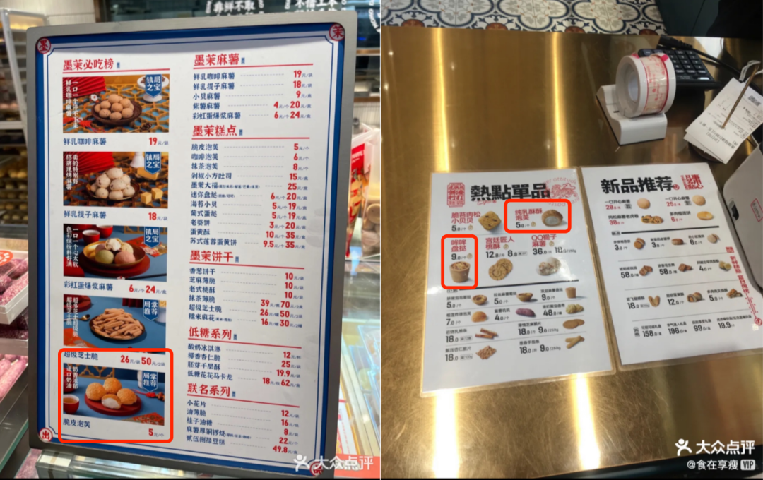 墨茉和虎头局的招牌是新中式烘焙,但事实上菜单设计更偏“中点西做”,将中式点心与西式糕点进行融合,抛弃传统糕点的酥饼、糕、糖、团等主打品类,以“麻薯”这个不太常见的中式点心占领“用户心智”。墨茉的招牌产品是鲜乳咖啡麻薯;虎头局的热门单品是黄油提子Q麻薯。