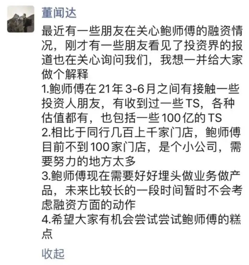 鲍师傅工作人员发布的关于融资传闻的朋友圈