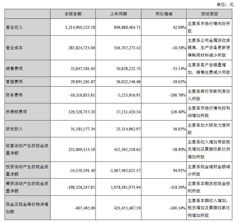 从数据中可以看出,安宁股份本报告期的营业成本、销售费用、管理费用、财务费用均下降,并且比例不低,研发投入则同比增加36.63%,达到3千万元以上,系加大研发力度所致。近三年,安宁股份先后与中南大学、成都理工大学等高校、科研机构开展合作,进行技术攻关,持续不断优化生产工艺。