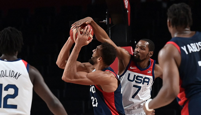 北京时间2021年8月7日,美国队与法国队的东京奥运会男篮决赛在埼玉超级竞技场进行。