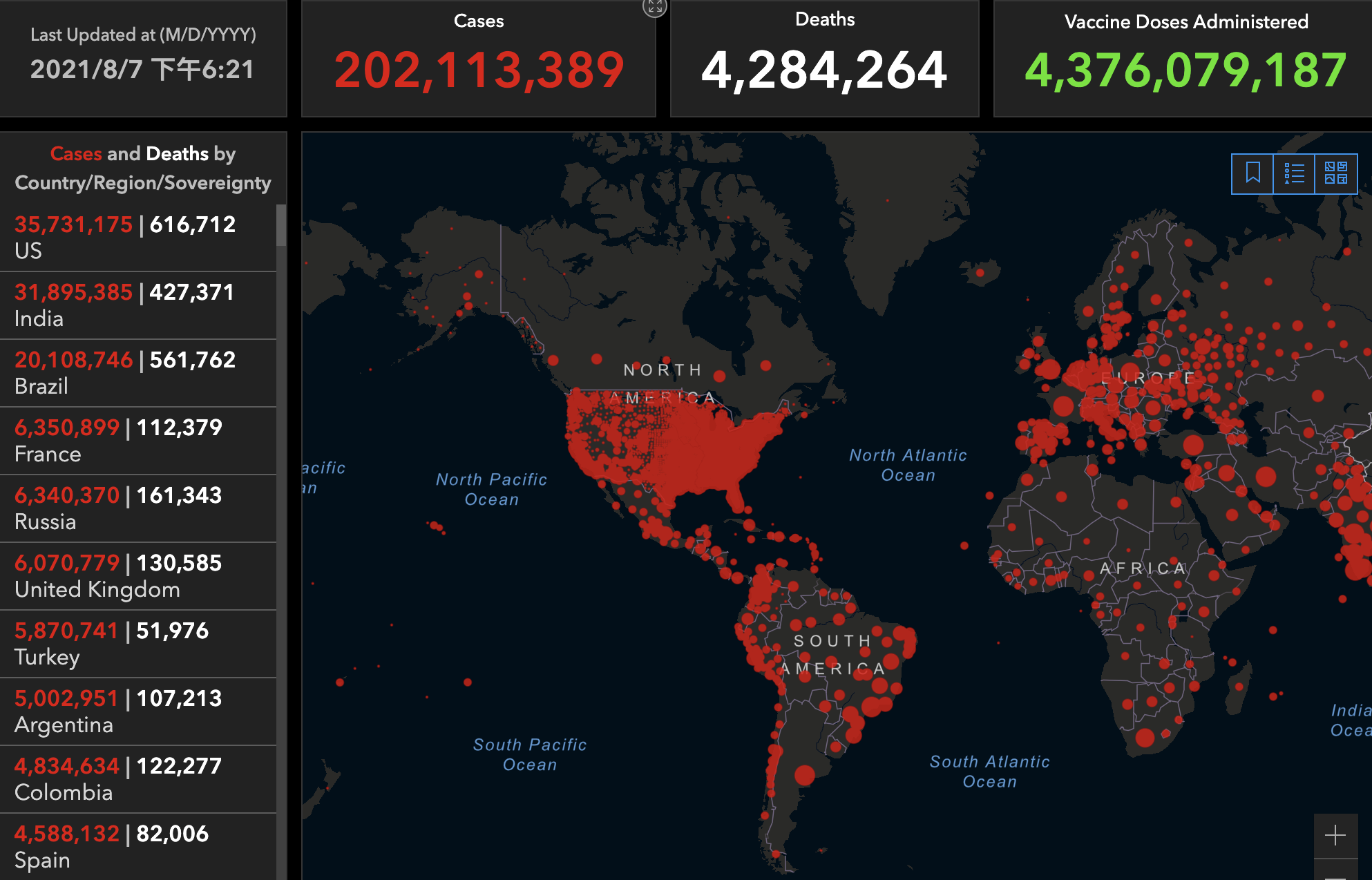 据约翰·霍普金斯大学的疫情追踪数据,截至北京时间8月8日上午8点,全球累计确诊新冠肺炎病例202113389例,累计死亡4284264例,接种疫苗超43.8亿剂次。