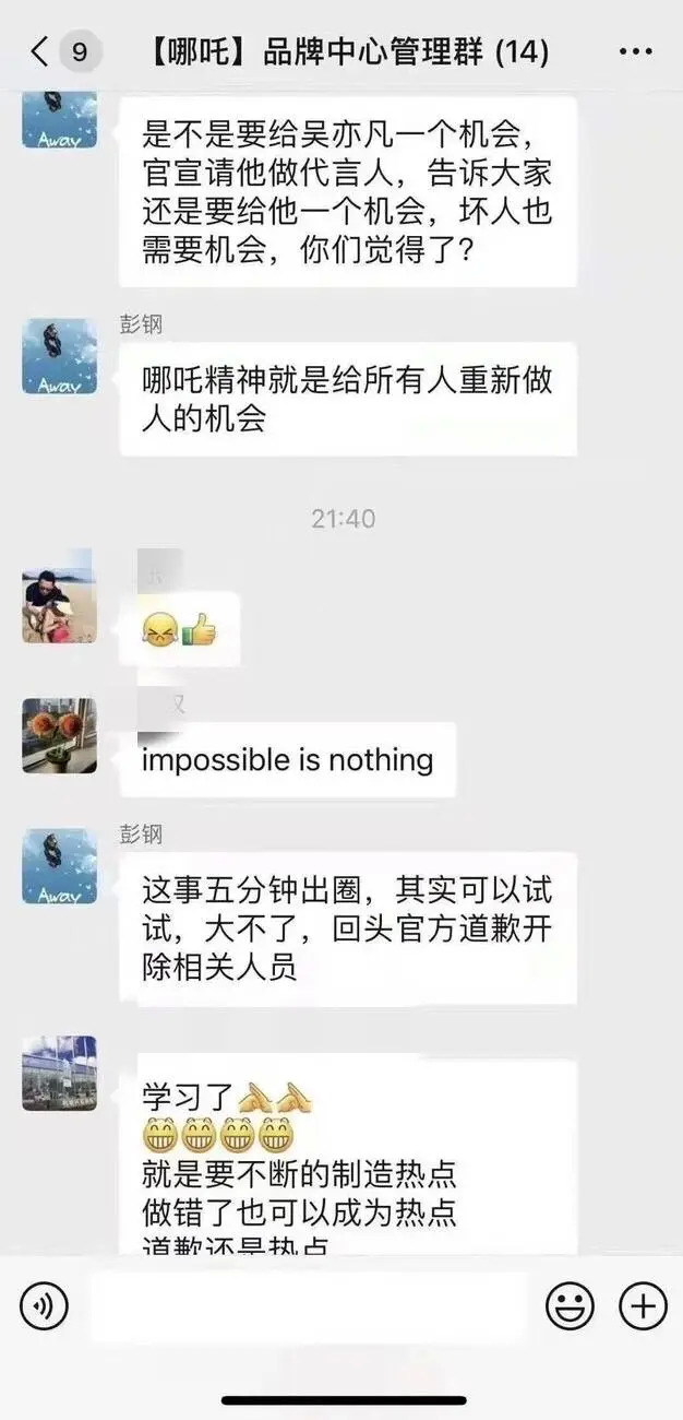 网上流传的截图显示,在“哪吒品牌中心管理群”里,市场负责人彭钢称:“是不是给吴亦凡一个机会,官宣请他做代言人?”还表示,“这事五分钟出圈,其实可以试试,大不了,回头官方道歉开除相关人员。”