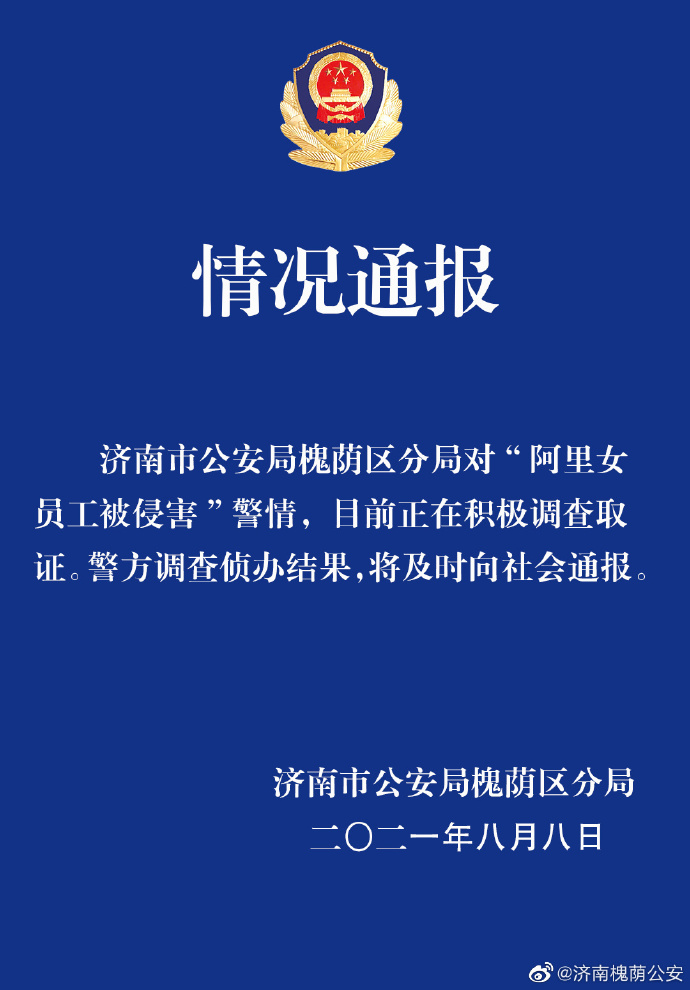 @济南槐荫公安 微博8月8日通报,济南市公安局槐荫区分局对“阿里女员工被侵害”警情,目前正在积极调查取证。警方调查侦办结果,将及时向社会通报。