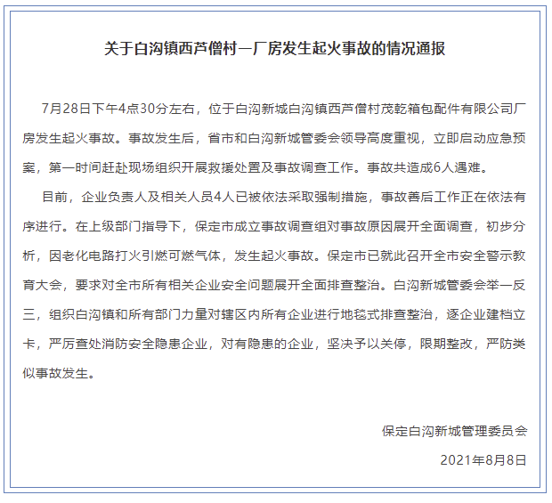 “保定白沟新城管理委员会”微信公众号8月8日消息,7月28日下午4点30分左右,位于白沟新城白沟镇西芦僧村茂乾箱包配件有限公司厂房发生起火事故。事故发生后,省市和白沟新城管委会领导高度重视,立即启动应急预案,第一时间赶赴现场组织开展救援处置及事故调查工作。事故共造成6人遇难。