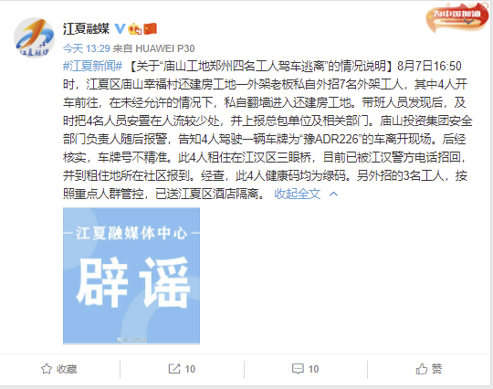 @江夏融媒 微博8月8日消息,8月7日16:50时,江夏区庙山幸福村还建房工地一外架老板私自外招7名外架工人,其中4人开车前往,在未经允许的情况下,私自翻墙进入还建房工地。带班人员发现后,及时把4名人员安置在人流较少处,并上报总包单位及相关部门。庙山投资集团安全部门负责人随后报警,告知4人驾驶一辆车离开现场。此4人租住在江汉区三眼桥,目前已被江汉警方电话招回,并到租住地所在社区报到。经查,此4人健康码均为绿码。另外招的3名工人,按照重点人群管控,已送江夏区酒店隔离。