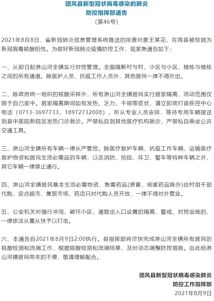 湖北黄冈团风县发布通告:淋山河全镇实行封控管理,居民实施居家隔离