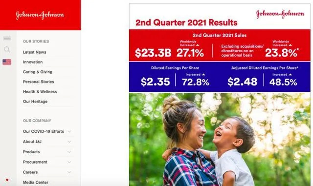 美国当地时间7月21日,强生公司公布了2021上半年及第二季度财报。财报显示,2021上半年,强生销售净额为456.33亿美元,同比增长16.9%;2021年第二季度销售额233 亿美元,同比增长27.1%。