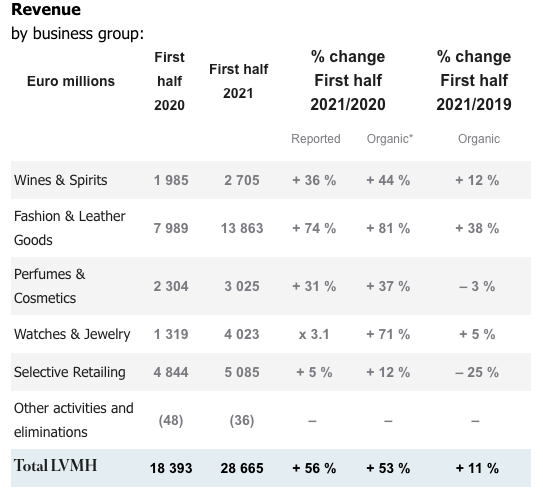 集团最大的业务——时装和皮具部门在2021上半财年实现了创记录的销售额,同比有机增长81%,较2019年同期有机增长38%。