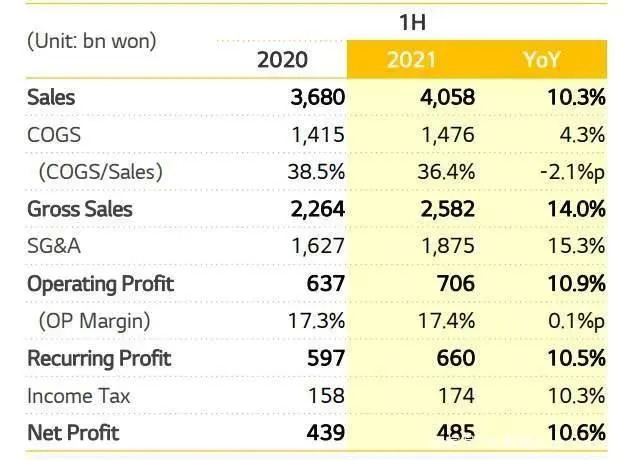 近日, LG生活健康也发布2021年Q2暨上半年财报。财报显示,LG生活健康上半年销售4.1万亿韩元(约合人民币231亿元),同比增长10.3%;净利润为4850亿韩元(约合人民币27亿),同比增长10.6%。