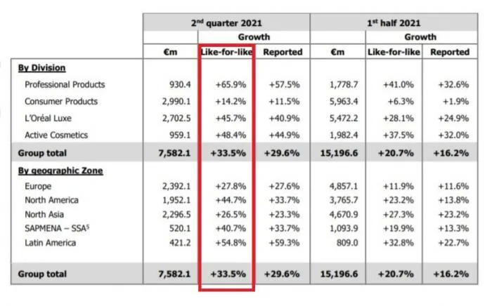 7月30日,欧莱雅集团(OREP)发布2021年上半年财报。报告显示,上半年集团实现销售总额151.9亿欧元,同比增长20.7%,其中二季度强劲增长33.5%,所有事业部以及所有区域均实现市场份额的增长。