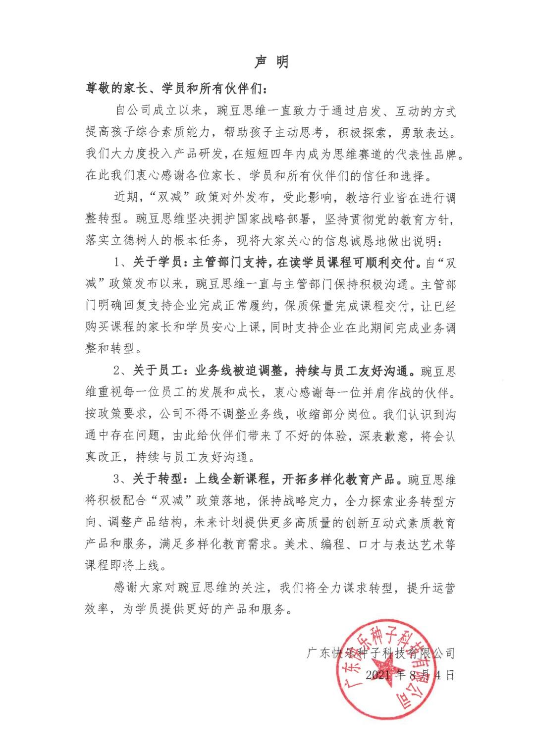 随着舆论不断发酵,8月4日,豌豆思维在微信公众号发表声明回应:“受双减政策影响,教培行业皆在进行调整转型,豌豆思维业务线被迫调整,收缩部分岗位。”