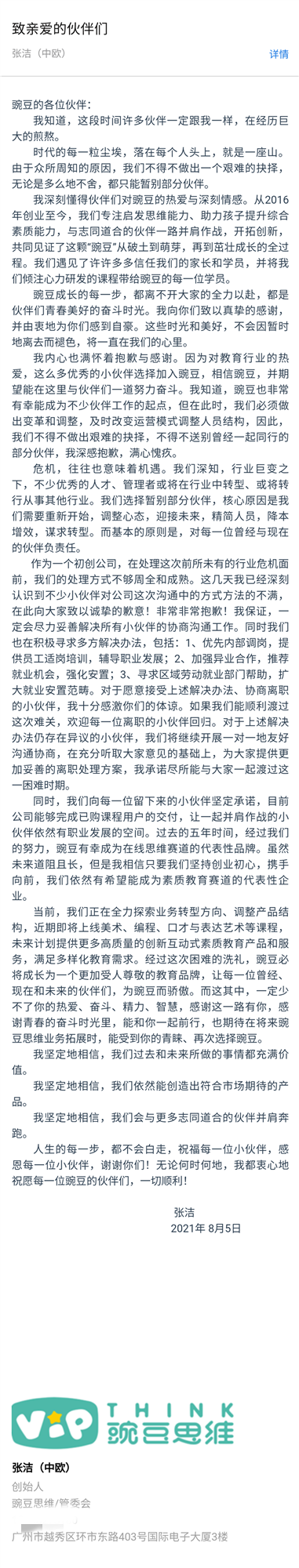 紧接着,8月5日,豌豆思维创始人张洁发布全员信,他提到正在寻求多种方法解决员工问题,包括内部调岗、加强异业合作、寻求区域劳动就业部门帮助。