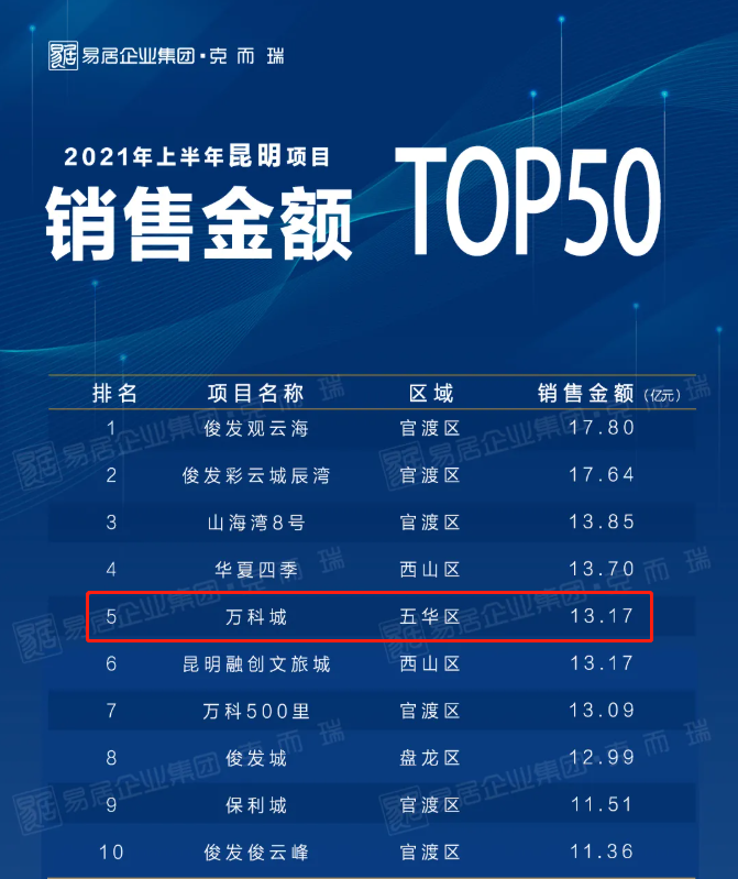 据昆明地产大数据发布的《2021年中昆明项目销售金额排行榜》可知,上半年万科城销售额位居昆明前五,五华区top1。