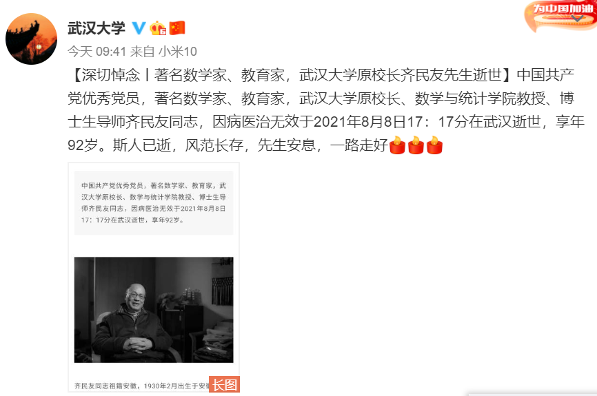 据@武汉大学 微博,中国共产党优秀党员,著名数学家、教育家,武汉大学原校长、数学与统计学院教授、博士生导师齐民友同志,因病医治无效于2021年8月8日17:17分在武汉逝世,享年92岁。