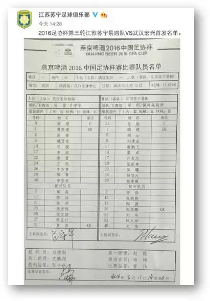 ▼武汉宏兴与江苏苏宁的首发名单,由于规则原因苏宁派出了全华班,而主裁判则是大连的寇建勋