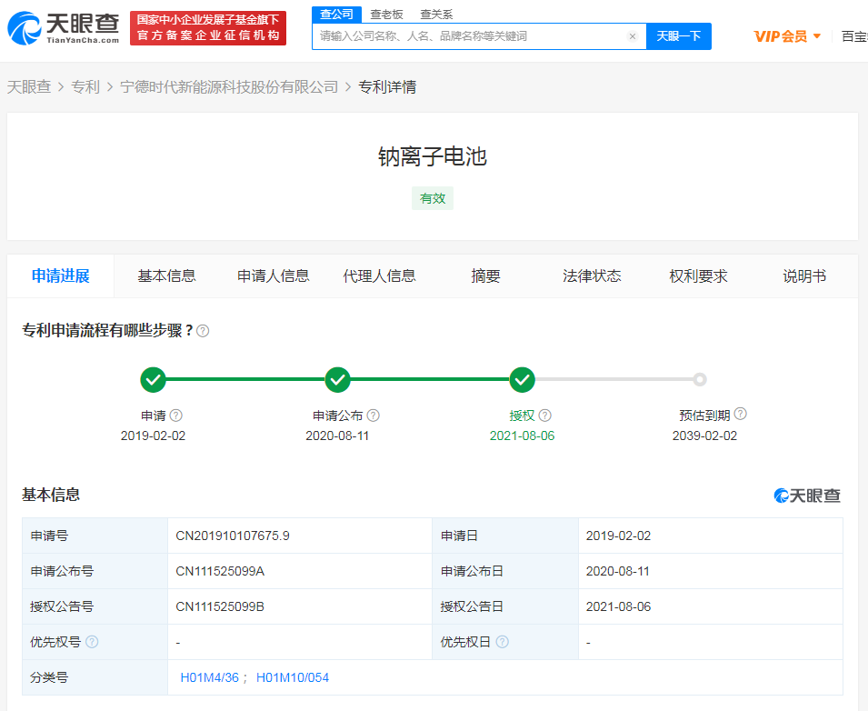 据天眼查APP显示,近日,宁德时代新能源科技股份有限公司获“钠离子电池”专利授权,公告号CN111525099B,申请日期为2019年2月。