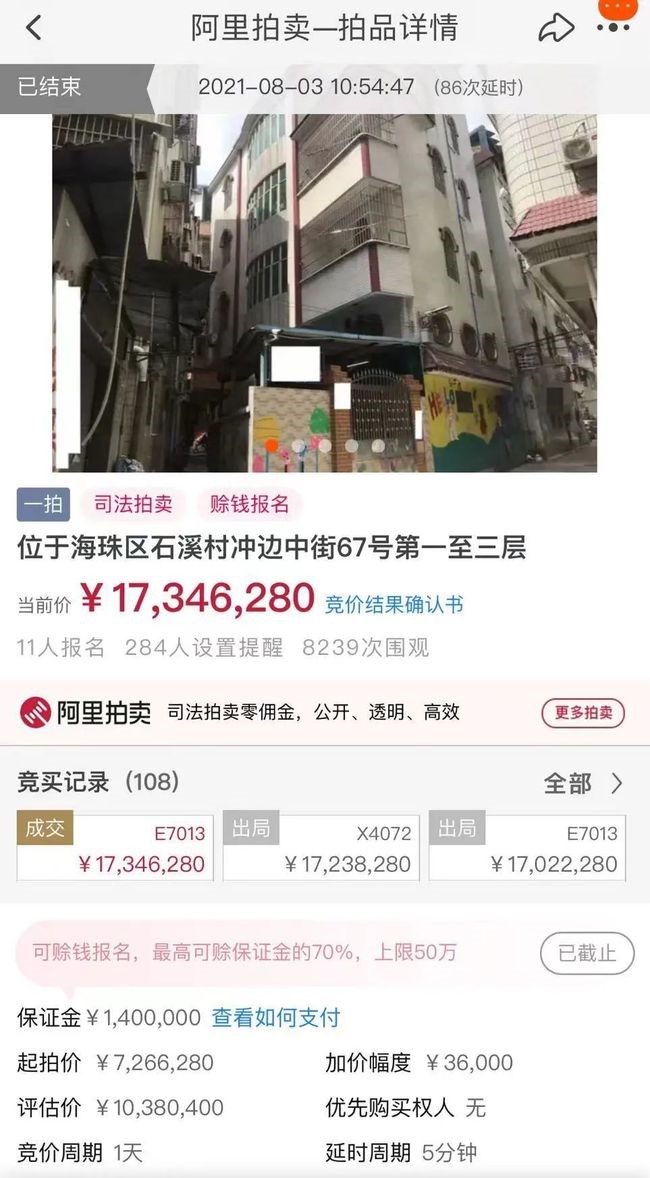 据了解,这栋楼位于海珠区石溪村冲边中街67号,因为地理位置优越及海珠区宅地紧张,在进行司法拍卖时,曾一度吸引了11人报名,起拍价726.628万,最终以均价3.9万/㎡,总价1735万元成交。