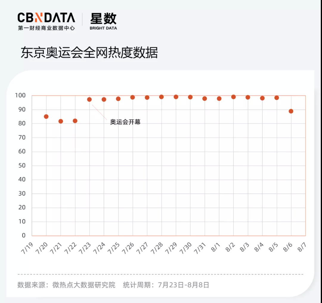 虽然外界一度为其冠上了“史上最冷”的称号,但连日来热搜排行榜上刷屏的相关词条和醒目的“爆”字表明,这届奥运比想象中热。根据微热点大数据研究院统计,从7月23日东京奥运会开幕式起,相关热议不断,最高热度指数一度超过99。