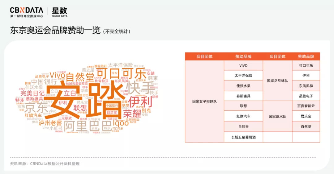 根据CBNData不完全统计,以代言、赞助为主要形式布局东京奥运会的品牌达35+,其中包括赛事赞助常客安踏、特步、可口可乐、伊利等国民品牌,也不乏韩束、自然堂、燕之屋等新鲜面孔。