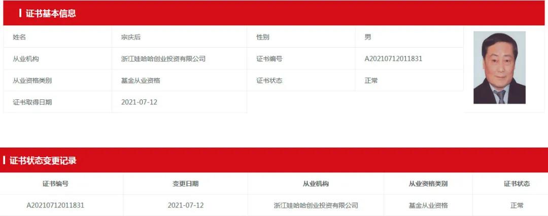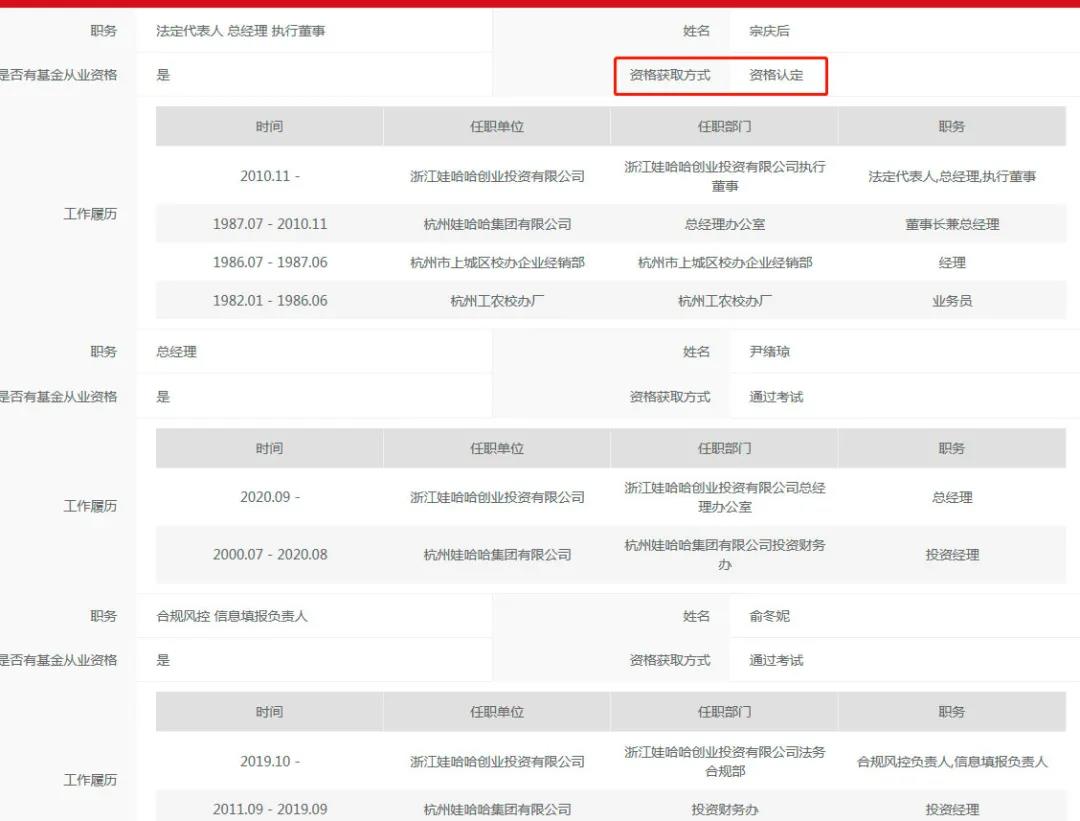 值得注意的是,宗庆后此次资格获取方式为资格认定,而尹绪琼、俞冬妮则是通过考试的方式获取基金从业资格,这两人都是宗庆后的老部下。