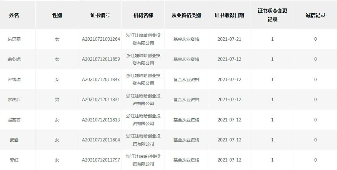 界面新闻记者查询中国证券基金业协会网站发现,与宗庆后一起拿到基金从业资格证书的还有娃哈哈创投公司的其他同事,除了朱思嘉是在7月21日拿到证书以外,其余5人也都是在7月12日拿到基金从业资格证书。