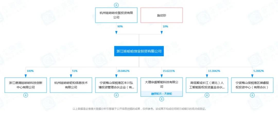 天眼查App数据显示,娃哈哈创投成立于2010年11月。从出资比例来看,杭州娃哈哈宏振投资有限公司认缴比例为90%,宗庆后妻子施幼珍认缴剩余的10%。