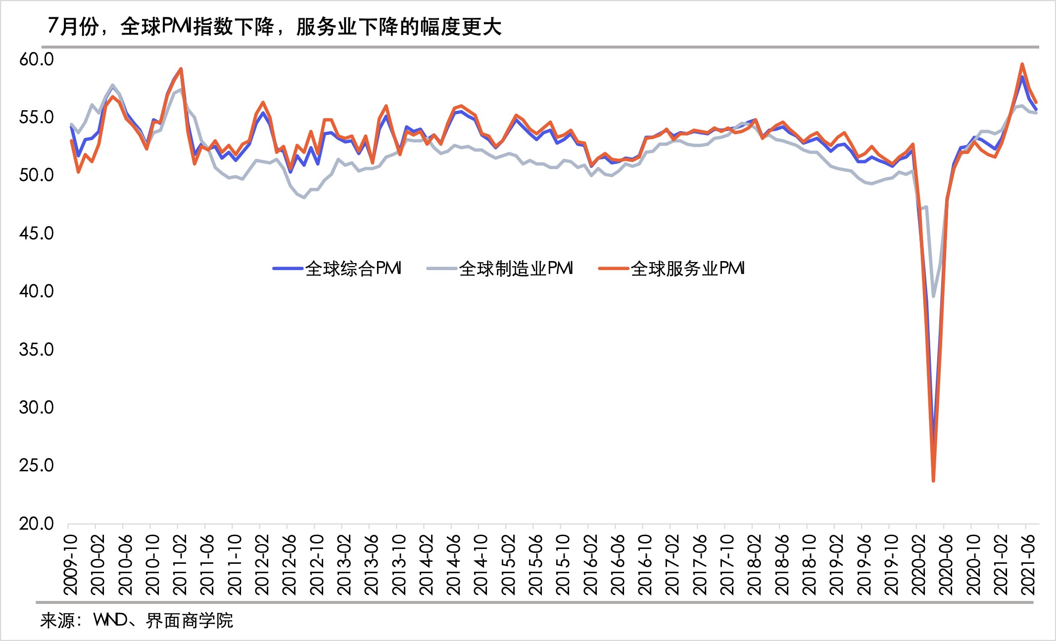 不过,最近两个月,服务业扩张速度下降的国家数量有所增加,环比上月减少的经济体数量从5月份的3个增加到7月的5个。