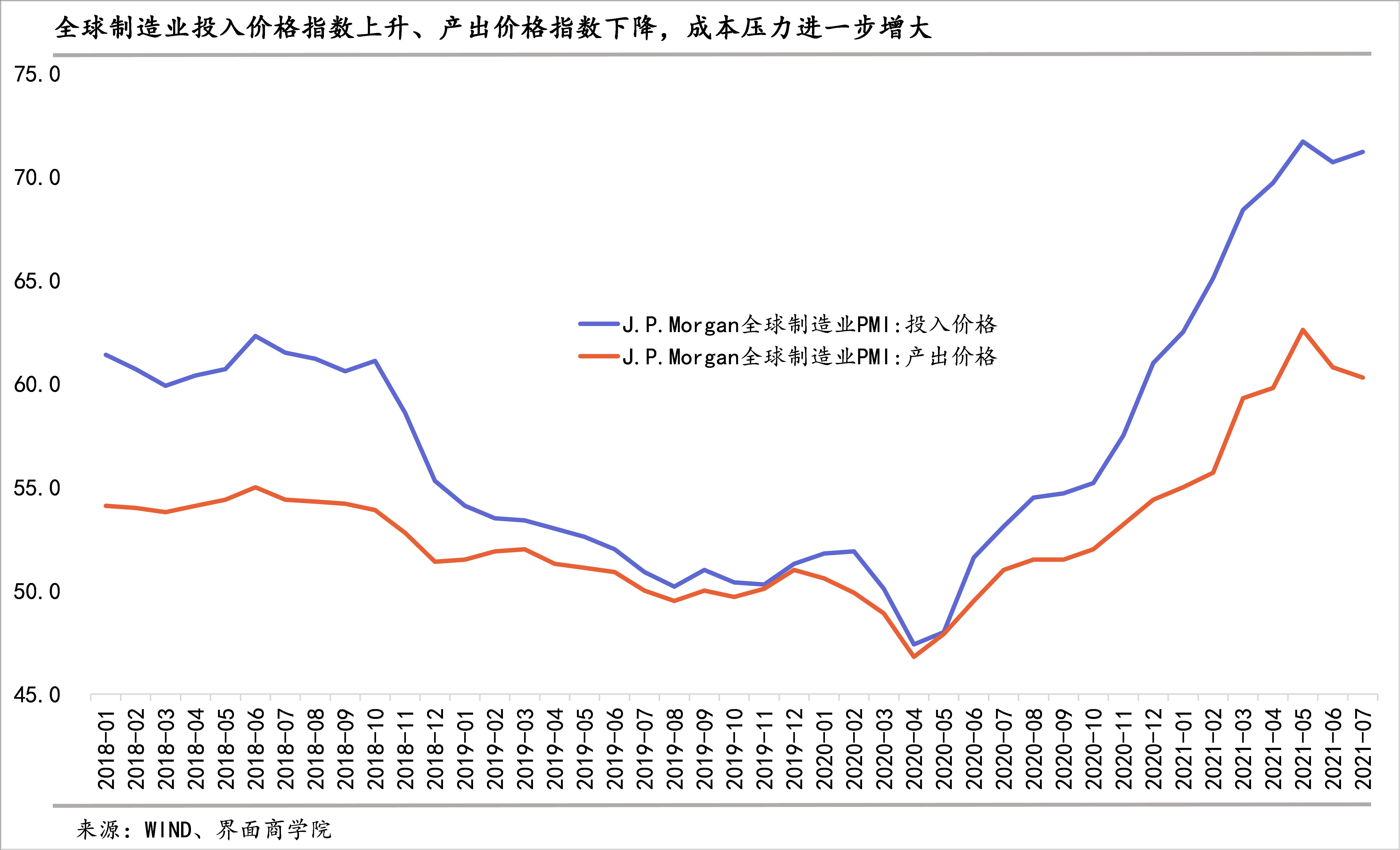 物价上涨压力进一步加大。7月份,无论是制造业还是服务业,投入品价格和产出品价格均在进一步扩张,扩张速度也比较快,制造业和服务业投入价格指数扩张速度显著快于产出价格指数。IHS Markit编制的J.P.Morgan全球PMI指数显示,7月份,制造业PMI投入价格指数录得71.2%、制造业PMI产出价格指数录得60.3%;服务业PMI投入价格指数录得64.1%,服务业产出价格指数录得57.1%。