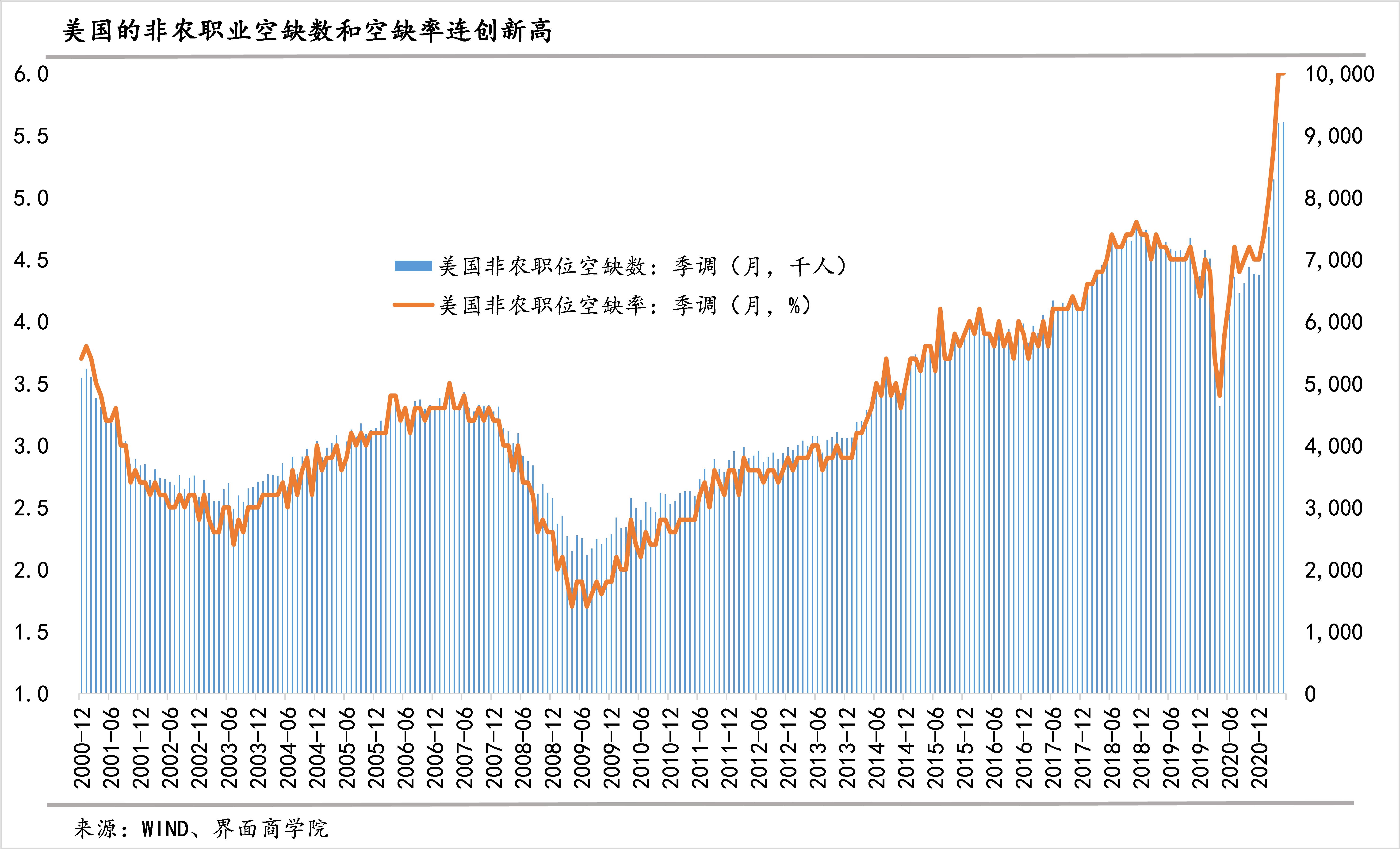 美国非农职位空缺数自3月以来不断创下新高,到最新公布的5月份,已经超过了920万人,较疫情前最高值2018年11月757万,多近170万个空缺;职位空缺率也不断创下新的纪录,到5月份已升至6.5%。