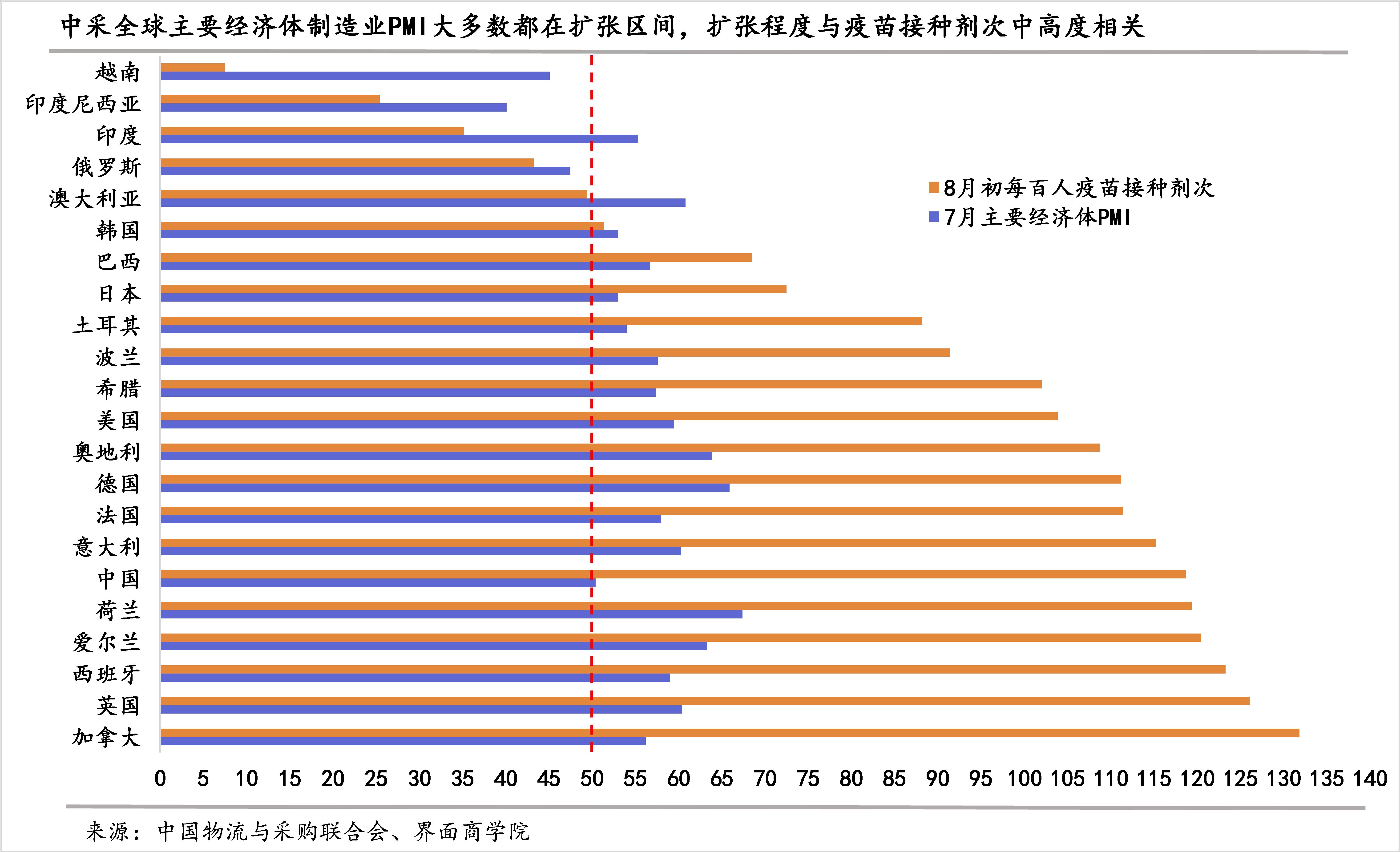 如果对比主要经济体PMI与他们的每百人疫苗接种剂次,可以发现,无论是制造业还是服务业PMI都与每百人疫苗接种剂次中高度正相关(制造业和服务业的7月PMI与8月初每百人疫苗接种剂次相关系数分别为0.69、0.79)。